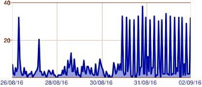 O gráfico acima refere-se a visualizações deste blogue nos últimos dias (26.Agosto a 02.Setembro). É evidente que o padrão da estatística mudou completamente! Na segunda metade do gráfico verificam-se “picos” regulares (30 a 35 visualizações) a intervalos de tempo regulares (entre 3 e 4 horas). Constatação: a maior parte das visualizações provém dos Estados Unidos da América... Any comment?